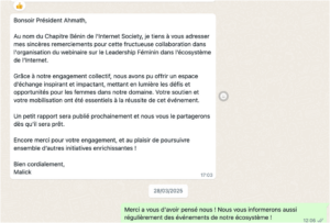 ISOC Sénégal s’engage résolument en faveur de l’inclusion des femmes dans l’écosystème numérique. Le programme Genre & Leadership Féminin vise à réduire la fracture numérique de genre et à promouvoir la participation active des femmes sénégalaises dans tous les aspects de la gouvernance, du développement et de l’utilisation d’Internet.